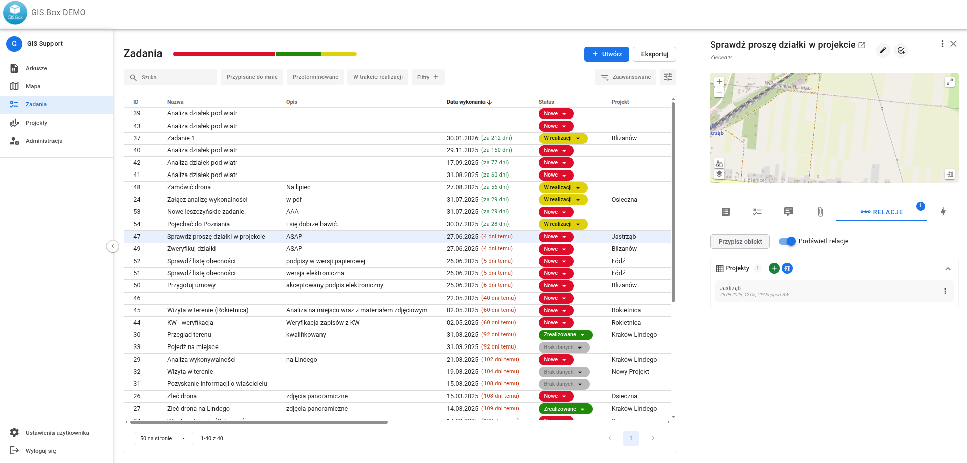 Do zadania poprzez relację można przypisać obiekt, którego zadanie się dotyczy (np. działka ewidencyjna, budynek)