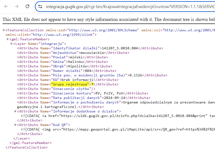 Chcemy przypisać numer rejestrowy działki ewidencyjnej, który jest dostępny w serwisie WMS KIEG, ale nie jest dostarczany przez usługę ULDK.
