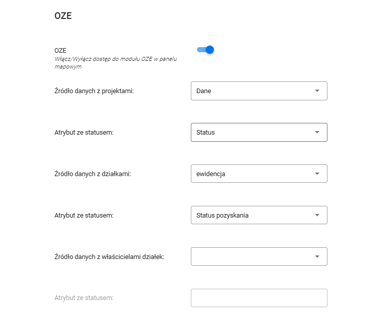 Moduł OZE służy do spójnego zarządzania danymi o projektach, działkach i właścicielach działek. Jego konfiguracja umożliwia systemowi prawidłowe rozpoznawanie źródeł danych.
